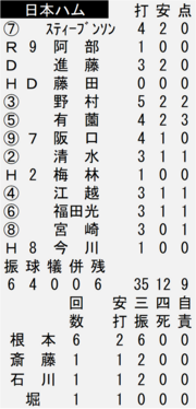 六回が一挙5得点のビッグイニングになった。この日、プロ初のセカンド守備に就いた先頭の江越大賀外野手(31)が右越えソロアーチを放った。2死一、二塁となり、野村の2点打で7-0に。続く有薗が2死二塁から左中間への2ランを放ち、9-0となった。有薗は4打数2安打3打点の活躍を見せた。