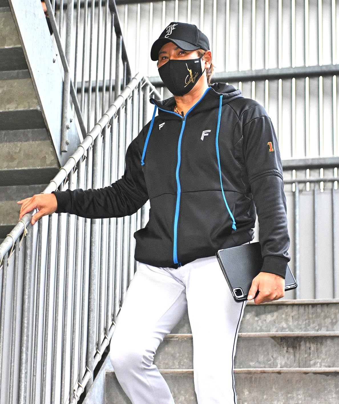 雨天中止が決まり、球場から引き揚げる新庄監督