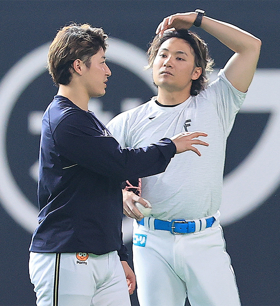日本ハムの試合前練習が終盤に差し掛かった頃。センター付近でキャッチボールをしていた伊藤のもとへ、吉田が駆け寄った。身ぶり手ぶりを交え、その場で10分近く話し込んだ。
