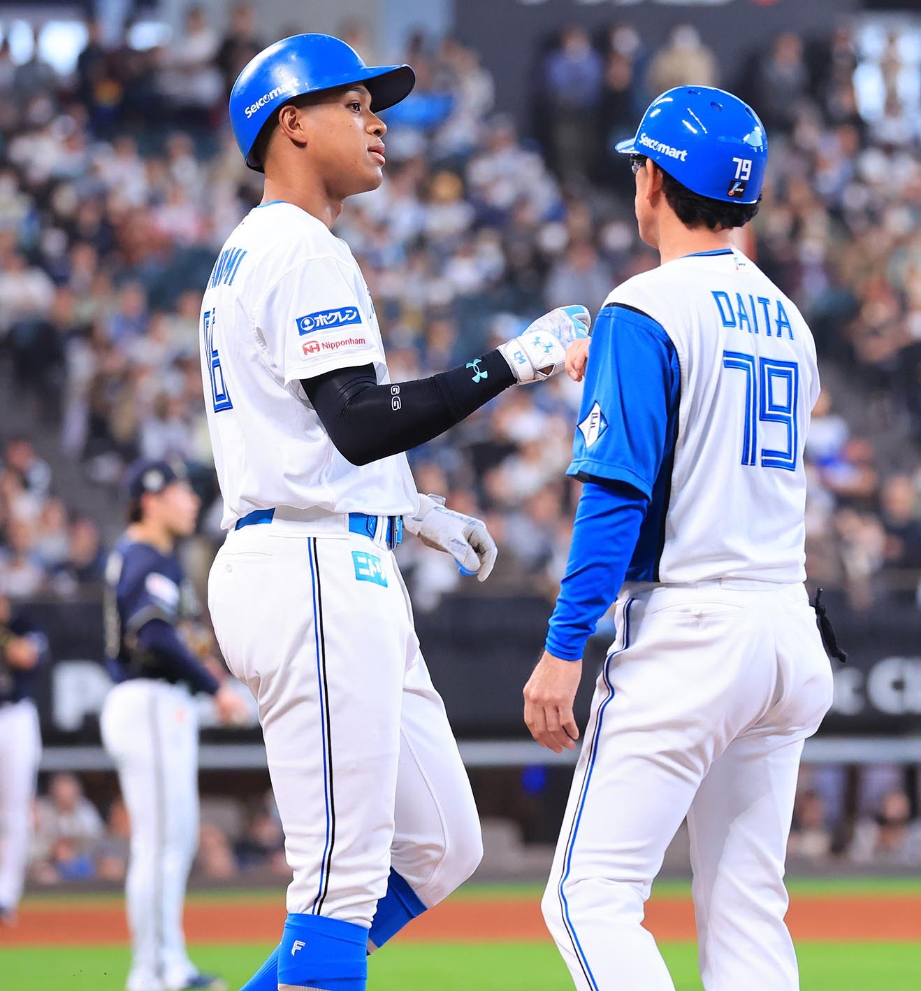 4月28日のオリックス戦(エスコンフィールド北海道)。試合前に談笑する万波とオリックス・吉田輝星(手前)