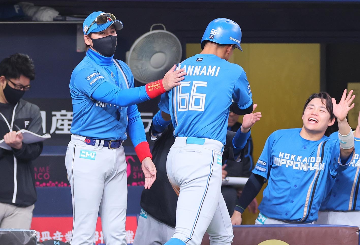 一回2死二塁、郡司の適時打で生還した万波(中央)をねぎらう新庄監督=撮影・村本典之