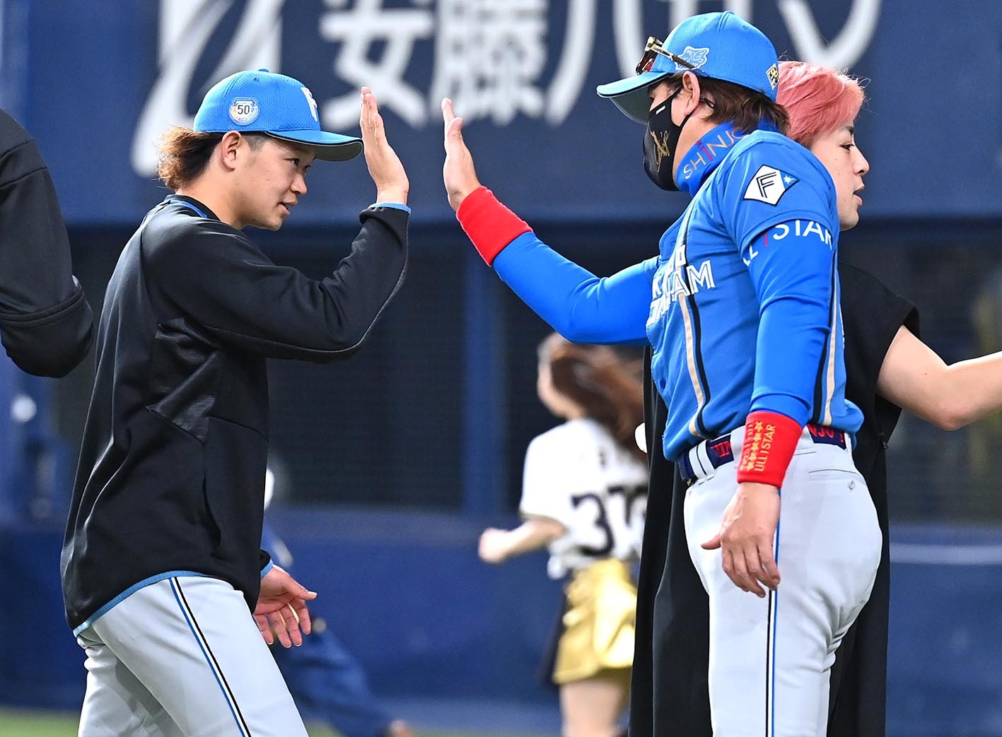 試合終了後、新庄監督(右)とハイタッチを交わす鈴木
