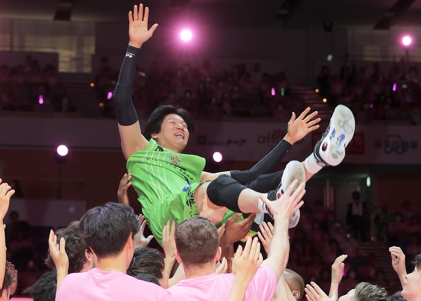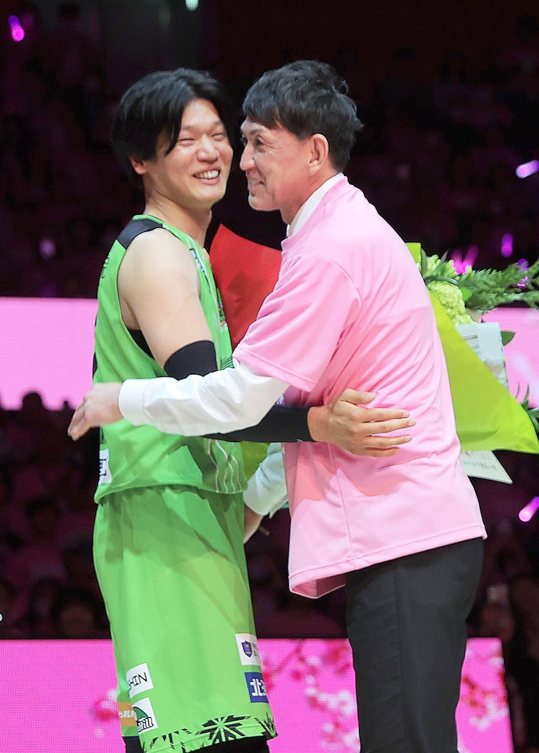 セレモニーで花束を渡した折茂武彦代表(53)は「良太、ほんとに17年間お疲れ様でした。17年前に良太と一緒に北海道に来て、チームの消滅だったり、チームの勝てない時期が続いたり、環境が悪かったり、クラブがまた厳しい状況になったり。苦しくて辛かったかもしれないですけど、本当にチームをけん引してくれたと思います。本当に良太には感謝してます」と、二人三脚で築き上げてきたチーム黎明期を振り返った。折茂代表が花束を渡すと、握手に照れる折茂代表をA東京の橋本竜馬に背中を押され、握手を交わしハグした。そしてセレモニーの最後には、両チームのメンバーから背番号にちなみ11回宙を舞い「バスケット選手として幸せでした」と感謝した。