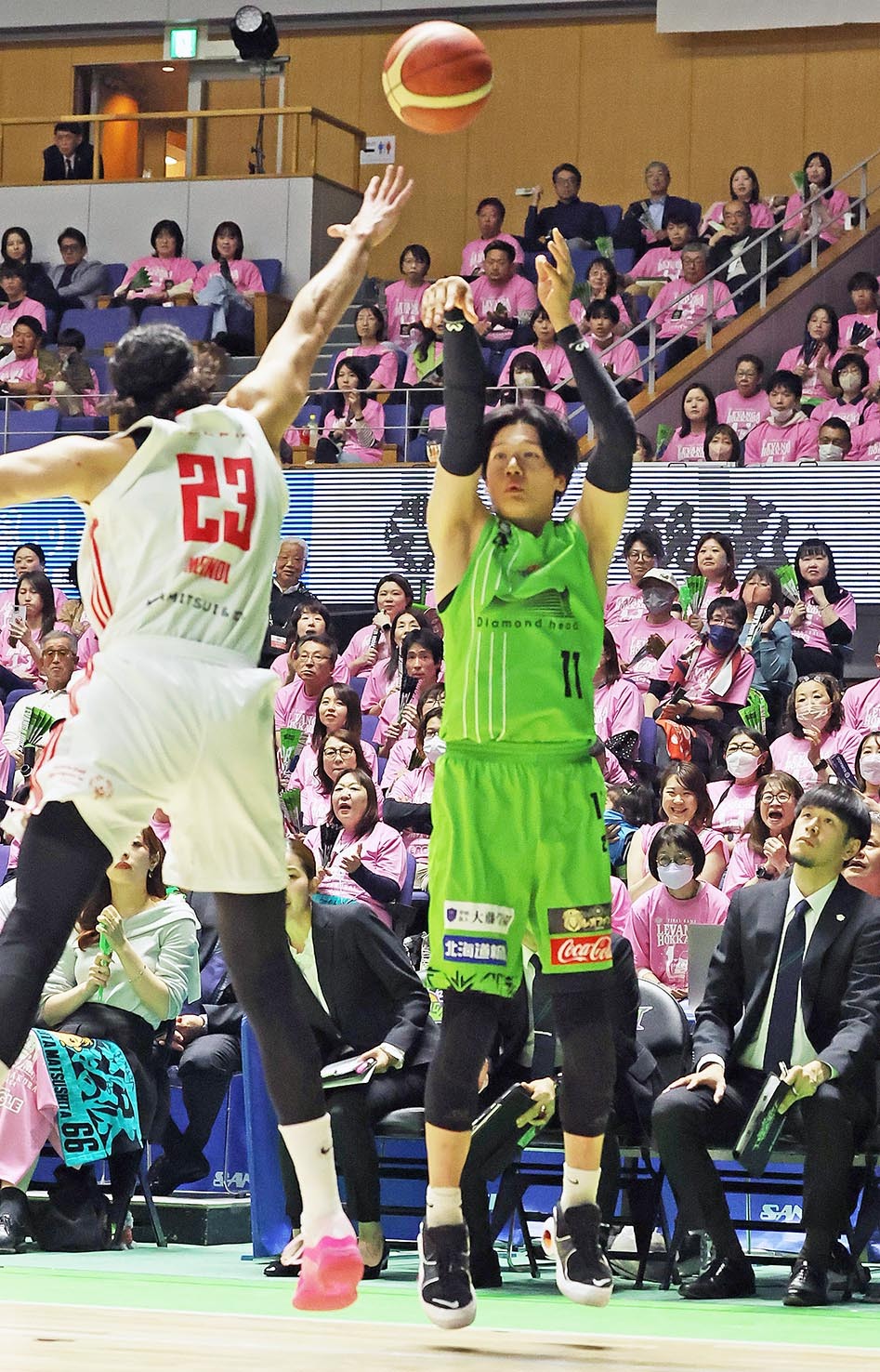 第2Q、現役最後の3点シュートを決める桜井(右)