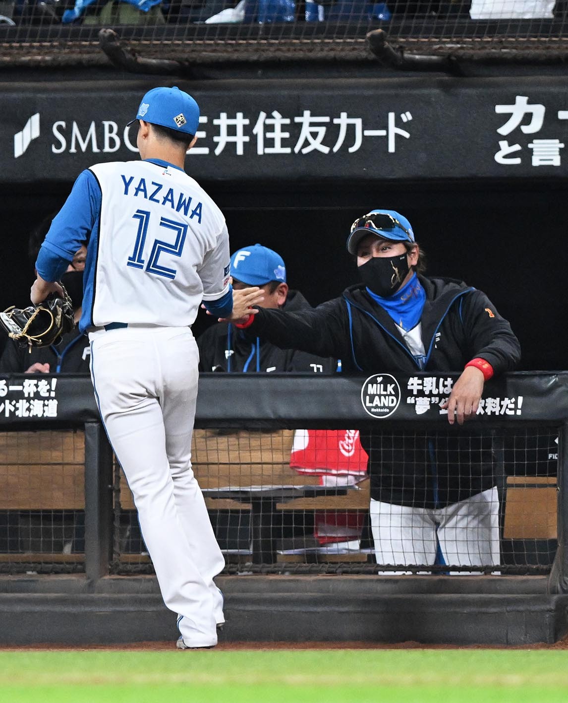 五回に登板して追加点を阻止し、新庄監督(右)に迎えられる矢沢