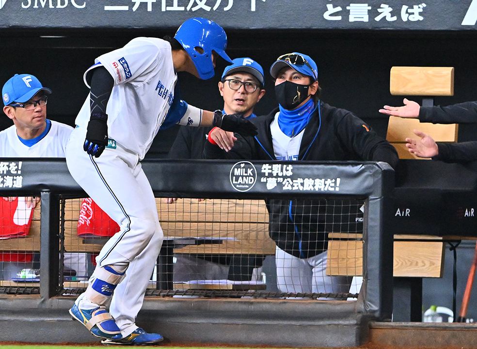 六回1死一、三塁、右犠飛を放った田宮(手前左)を迎える新庄監督(右)
