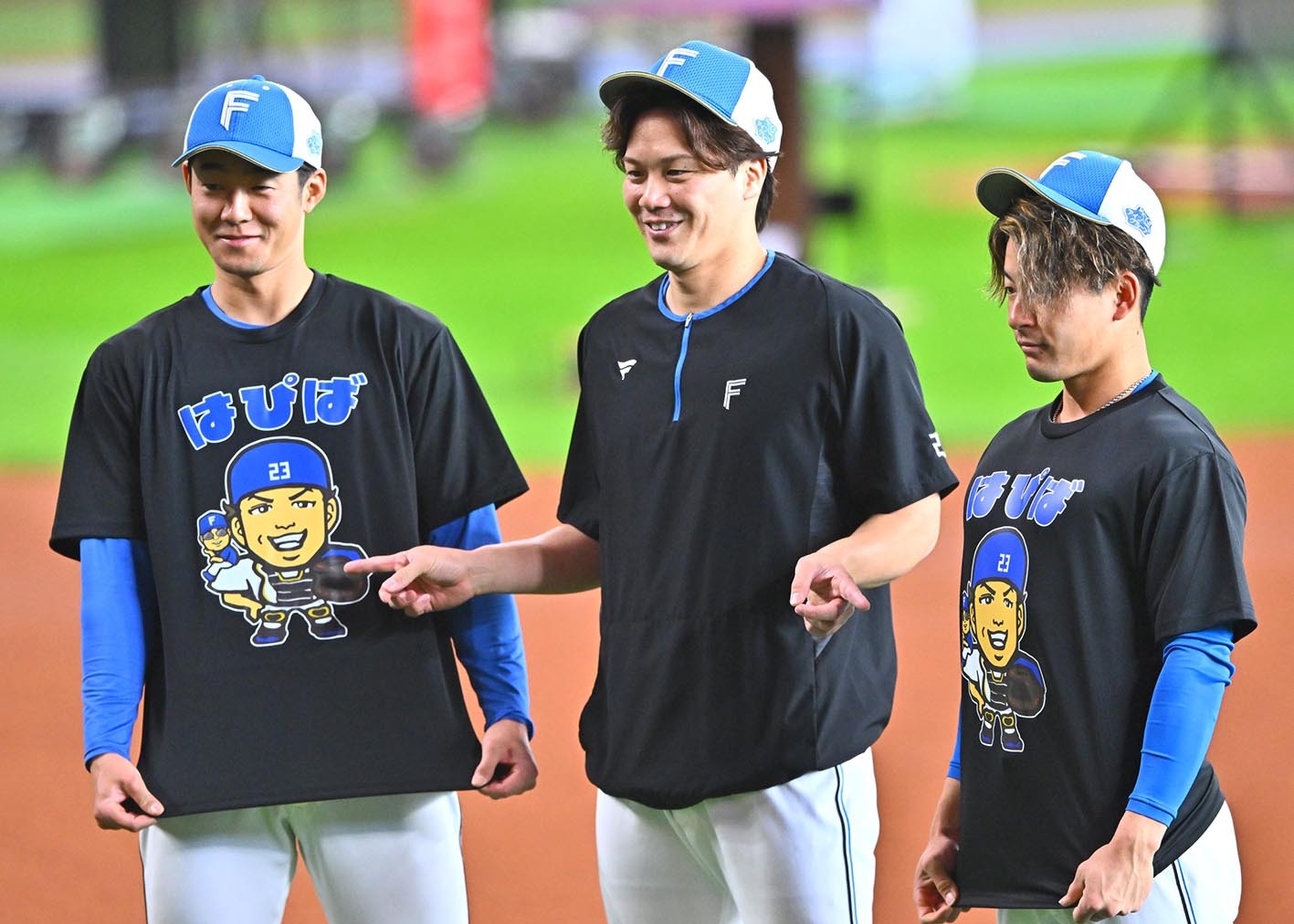 伏見も大喜びだったという粋なサプライズ。仕掛け人は、2軍施設の鎌ケ谷で調整を続ける右腕だった。石井によると「あれは池田が作ってくれました」。エスコンフィールド北海道に来られない池田に代わって、球団スタッフがロッカーの前に特製Tシャツを置いたという。