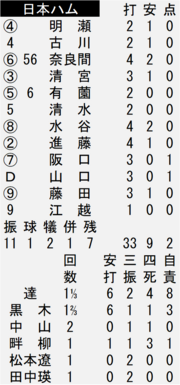 打線はラスト九回にやっと反撃に出た。先頭の5番・水谷瞬外野手(23)が左前打、続く進藤勇也捕手(22)は二塁打でつないで二、三塁とした。ここで7番の阪口楽内野手(20)と続く山口アタル外野手(24)に犠飛が飛び出し2点を奪った。