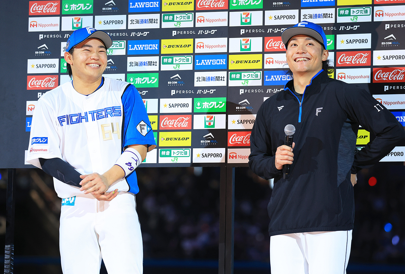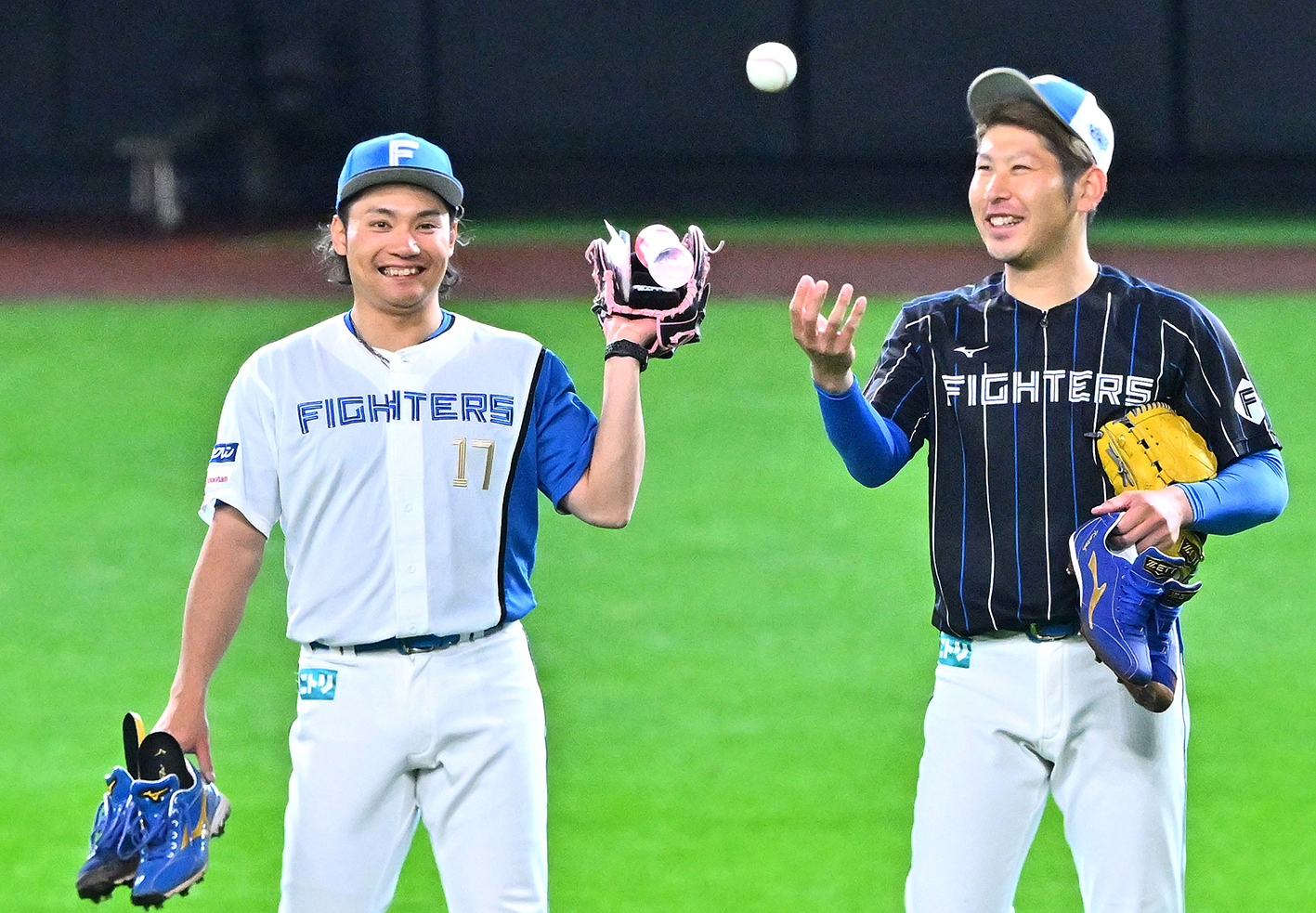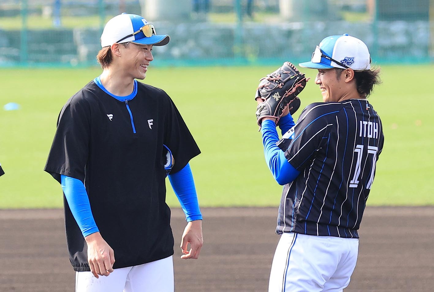 最近、しゃべるようになりました。話すんですけど、あの人はとにかく帰るのが早いんですよ。風のように帰るので、気付いたらロッカーが閉まっている。一番遅く来て、一番早く帰るので、話すタイミングがあまりない。あと、相づちが「へぇ~」、「あっそうなの」、「マジか~」とかなので、会話にならないんですよ(笑)。でも、ヒーローインタビューとか見ていると、良いこと言うじゃないですか。考えているんだな、中身は熱いんだなって。普段は謎に包まれていて、みんなあんまり深く分からない。(エスコンでの)残留練習は(午前)10時から始まって、12時くらいにご飯が来るんですけど、いつもロッカーでお弁当待ちしていますね(笑)。