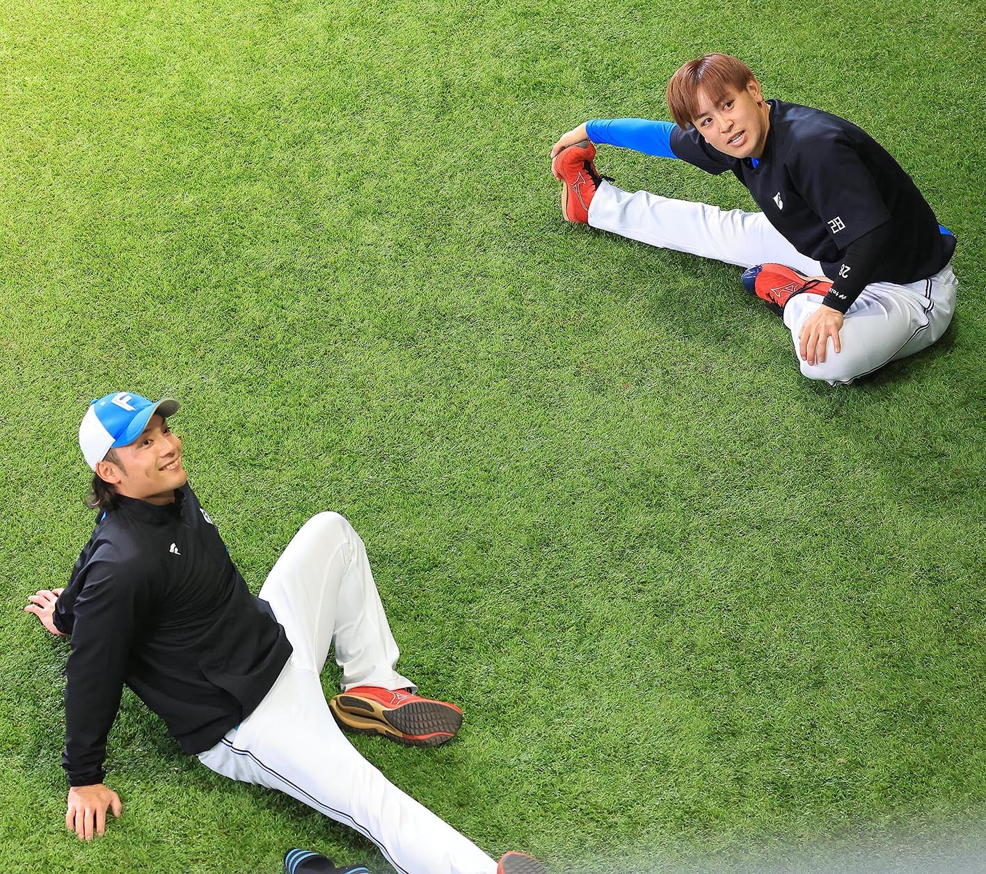 エスコンのロッカーは扉を挟んで剛さん、横は北山です。前からちょこちょこ話してましたけど、剛さんとはロッカーが近くなって、より話すようになりました。その日の試合展開とか、こうなりそうだなとかいう話をしながら、登板日には『きょう何点ですか?』って聞きます。それがだいたい、当たるんですよ。ロースコアを予想して、『きょう2点』みたいな日もあるし。適当じゃないんです。ちゃんと見込みを言ってくれる。開幕戦は『4点取る』と言って、本当に4点取った。験担ぎじゃないですけど、登板日に僕と目が合うと、ニヤニヤしてきます。
