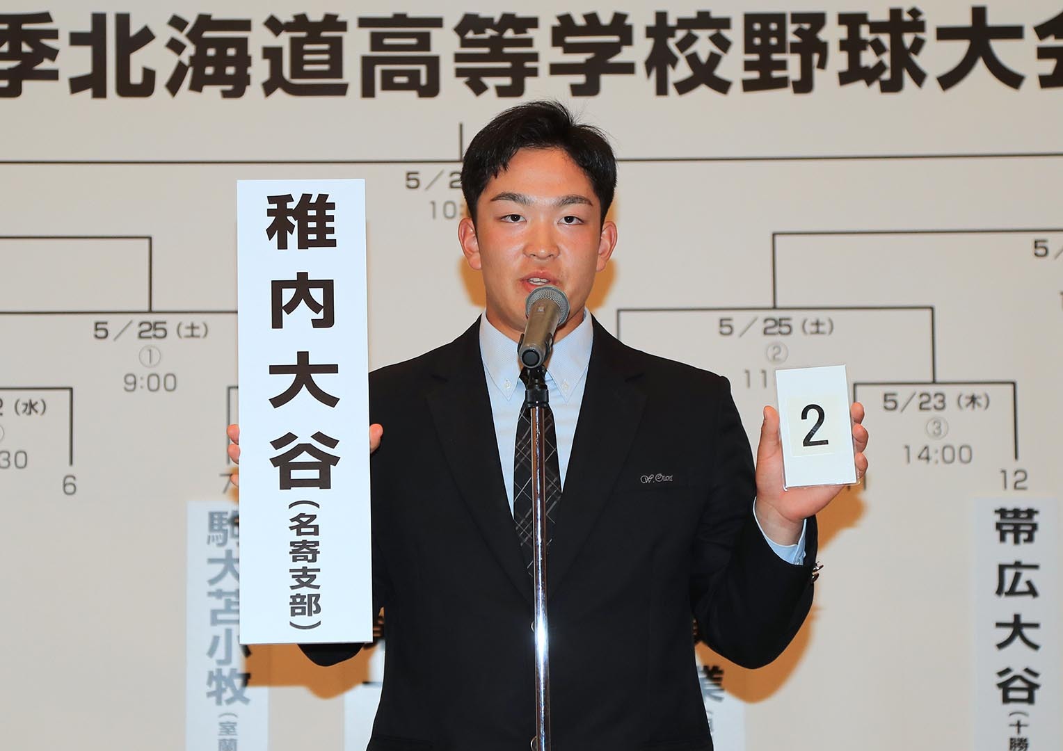 春季全道高校野球大会(5月22日開幕、札幌円山)の組み合わせ抽選会が5月17日に札幌市内で行われ、開幕カードは3年連続出場の稚内大谷と、選手宣誓を引き当てた遠軽が対戦することが決まった。