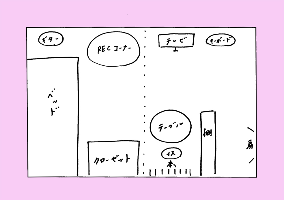 お部屋の間取りです。テーブルは低めの丸テーブルで椅子は床に置くタイプの座椅子です。本も床に並べて置いてます。