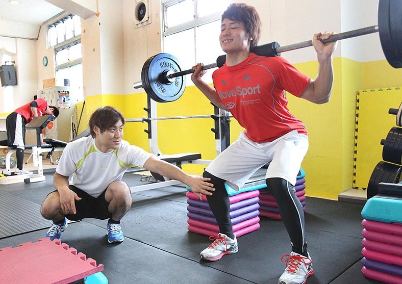 2011年1月、宮古島で行われた自主トレで田中氏(左)からウェートリフティングのアドバイスを受ける中島
