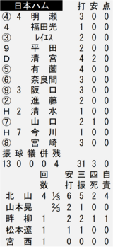 投げては先発した北山亘基投手(25)が五回途中4失点と崩れた。三回までは被安打1、毎回の5奪三振と上々の滑り出しだったが、四回に2安打2四球で先制を許すと、五回は、先頭から連打を浴び、犠打で1死二、三塁のピンチを招く。適時打で2点目を失い、一、三塁に走者を残して降板した。2番手の山本晃大投手(25)が適時打2本で走者をかえされ、点差は広がった。