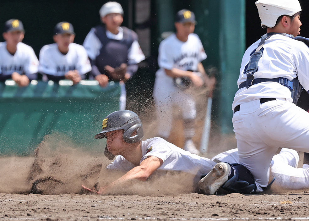 四回1死二塁、遠軽・池田の左前適時打で生還する二走・坂地