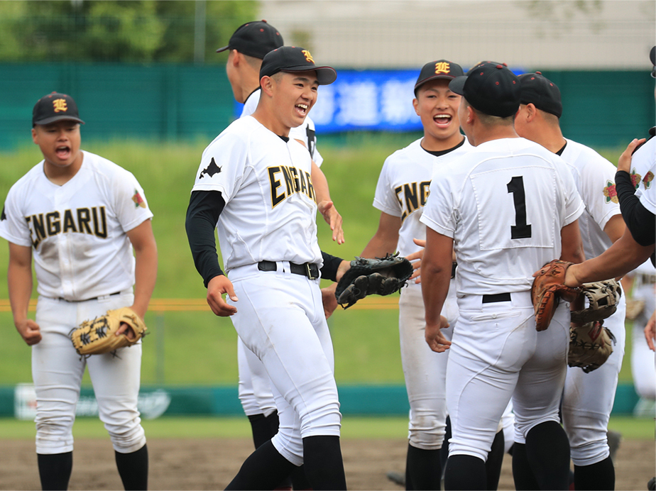 完投での勝利に笑顔を見せる遠軽の宮沢(左から3人目)