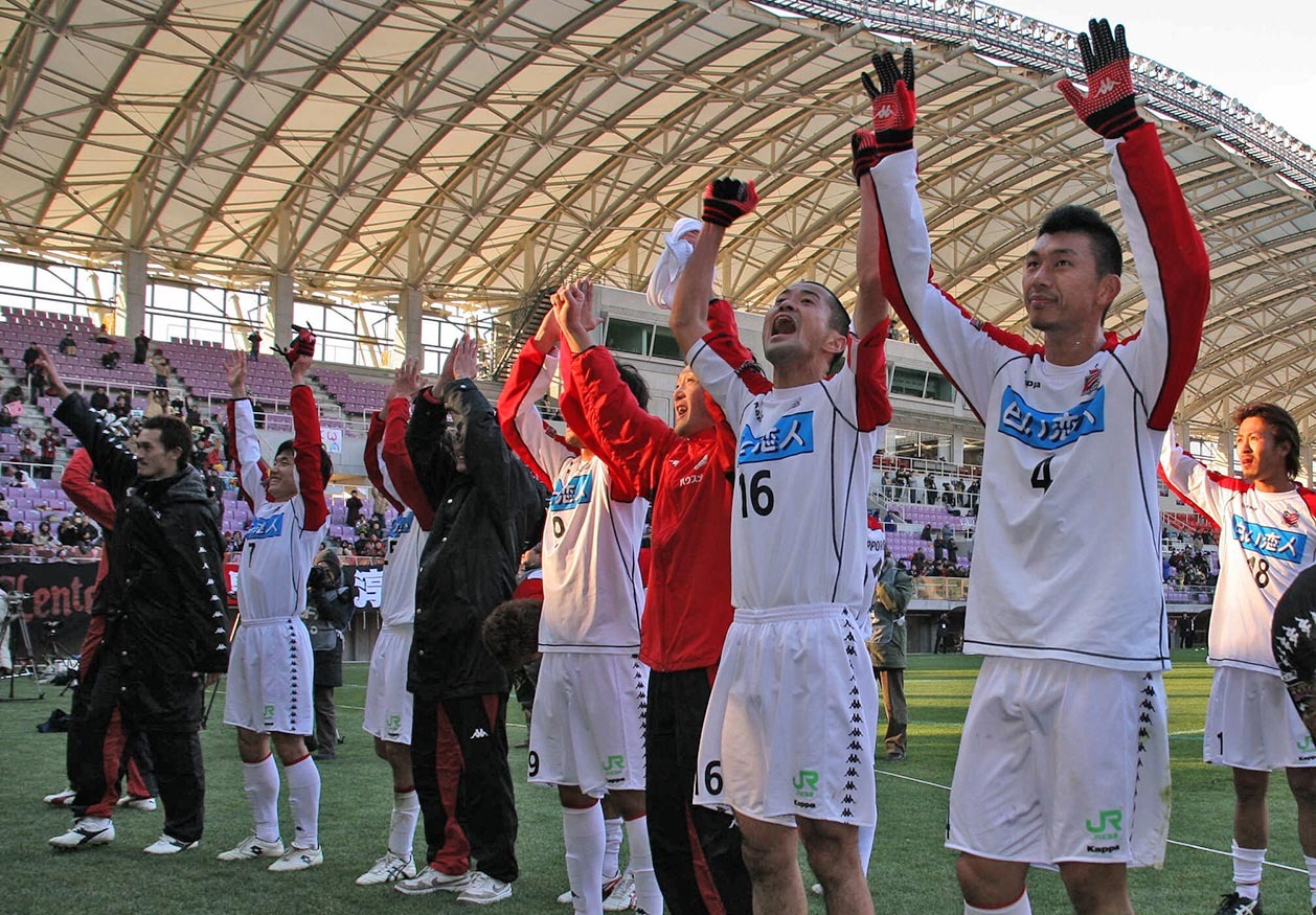 2006年の天皇杯準々決勝で甲府を破り、チーム史上初の4強入りを決め、サポーターにあいさつする札幌イレブン