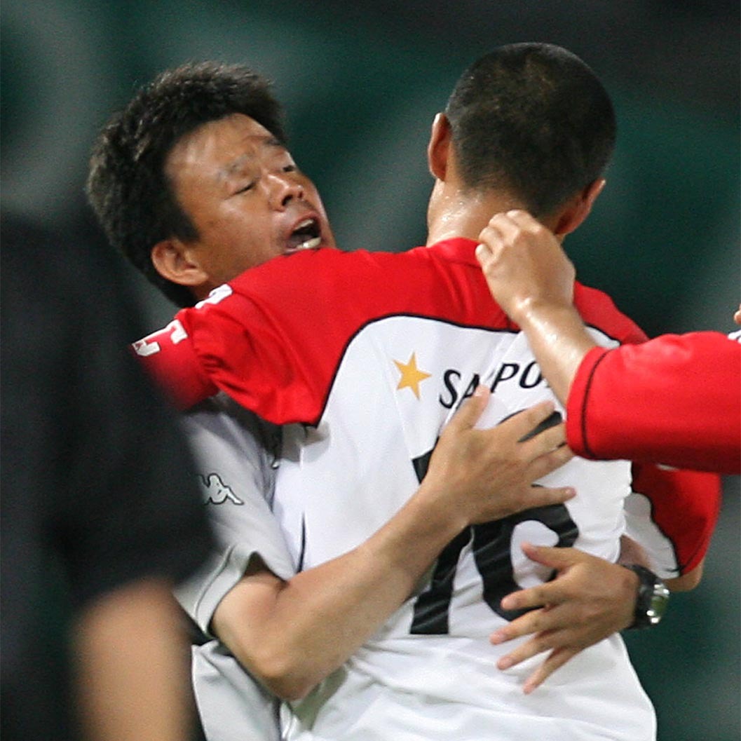 2006年7月26日、東京V戦で勝ち越しゴールを決めた大塚が柳下監督と抱き合って喜ぶ