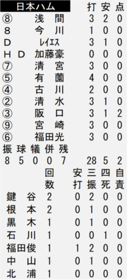 投げては七飯町出身の鍵谷陽平投手(33)が先発し、2回無安打無失点、2奪三振の凱旋投球。この後も小刻みに6人の投手が無失点でつなぎ、0封リレーとなった。4番手の石川直也投手(27)が勝利投手になり、最後を締めた北浦竜次投手(24)にセーブがついた。
