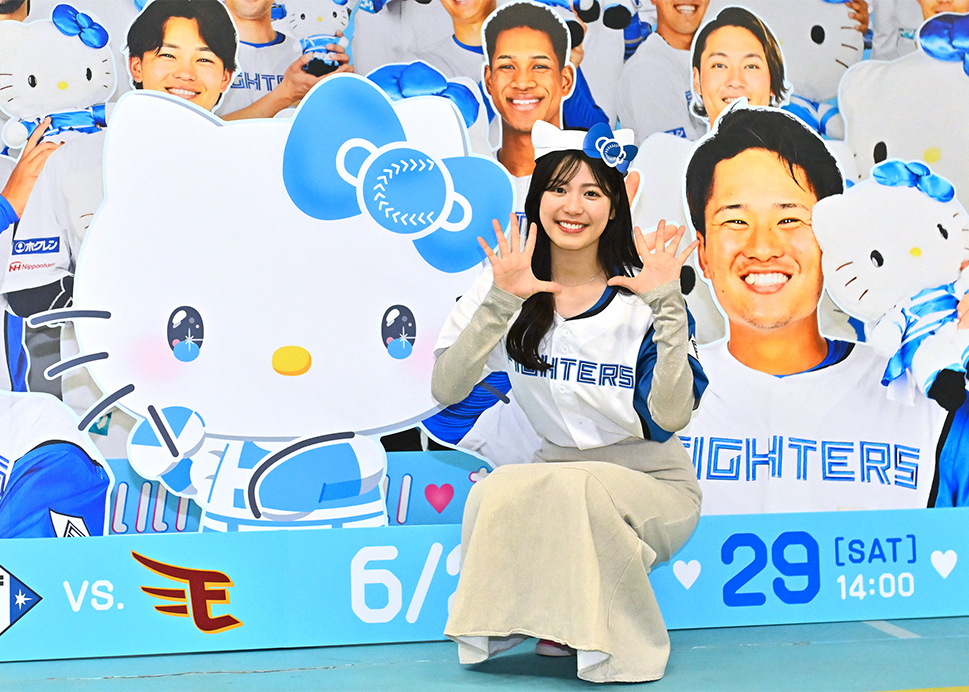 昨年までファイターズガールとして活動し、Fビレッジアンバサダーを務める滝谷美夢さんが巨大パネルの前に登場。「この期間に、普段はかっこいい選手のかわいい一面も見つけてもらえたら。キティちゃんのフォトブースがあったり、楽しめる場所がたくさんあるので、〝かわいい〟を楽しんでいただきたいなと思います」とキュートにPRした。