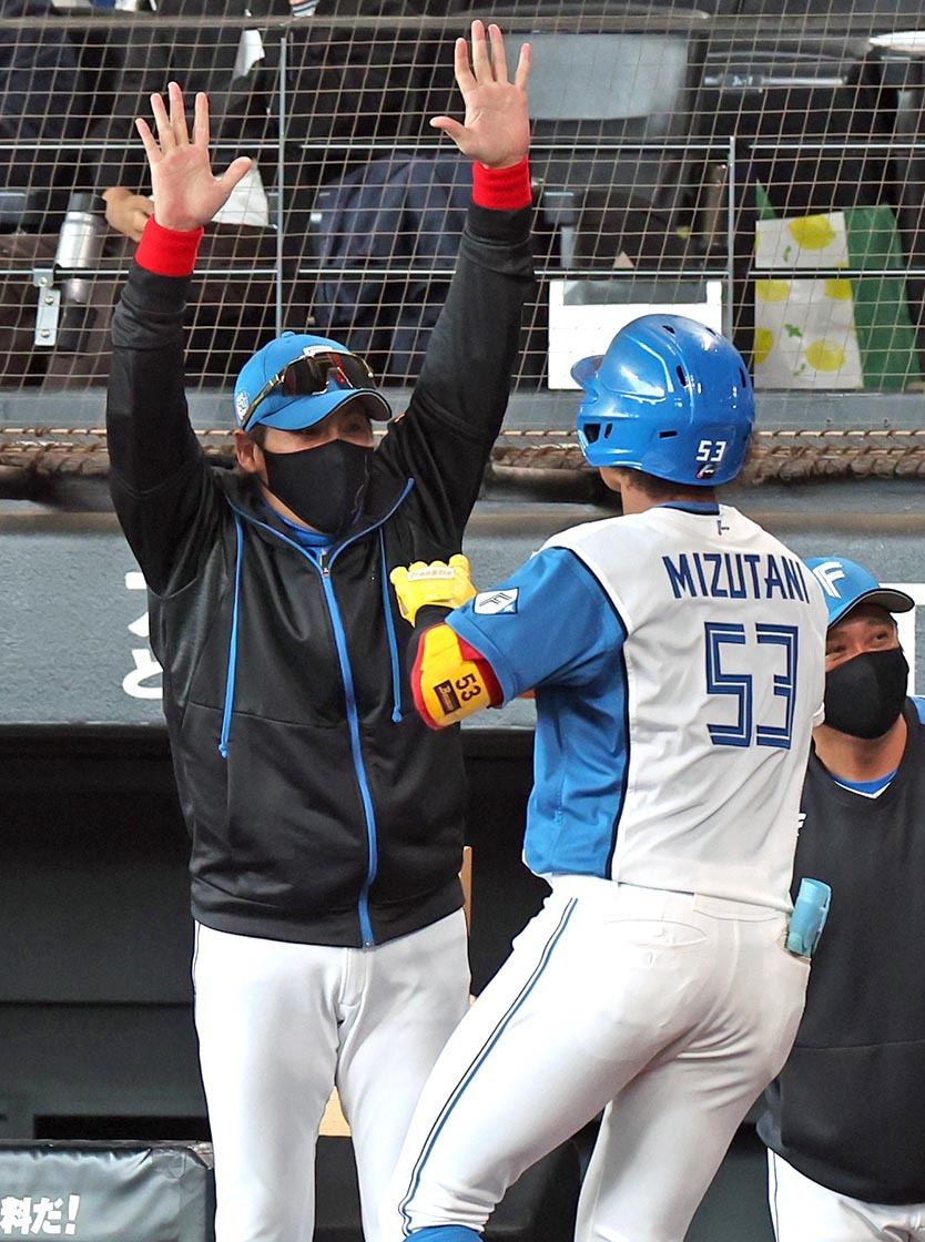 四回1死二塁、プロ初本塁打を放った水谷(右)を迎える新庄監督
