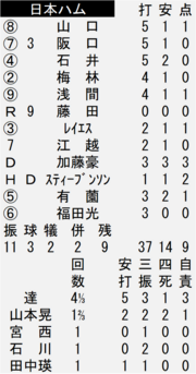 序盤はホームラン攻勢を見せた。一回、山口アタル外野手(25)の2号ソロで先制。二回にはフランミル・レイエス外野手(28)と加藤豪将内野手(29)の一発で2点を加えた。3―3と追い付かれた直後の五回には2死二、三塁で加藤豪が右翼へ勝ち越しの2点打を放った。5―4の七回には無死満塁で代打のアンドリュー・スティーブンソン外野手(30)が右翼へ2点打。さらに有薗直輝内野手(21)にもタイムリーが飛び出した。8―4の八回には1死一塁で浅間大基外野手(27)がダメ押しの適時三塁打をマークした。
