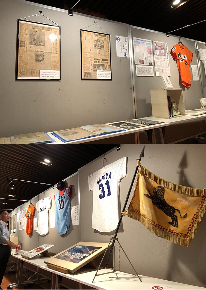 講演会では都市対抗優勝チームに与えられる黒獅子旗のレプリカや当時のユニホーム、新聞紙面などが飾られた