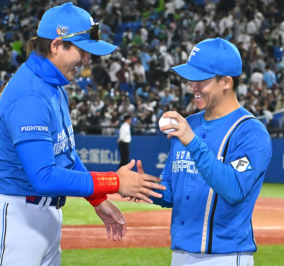 ウイニングボールを手に新庄監督(左)とともに記念撮影に応じる矢沢=撮影・桜田史宏