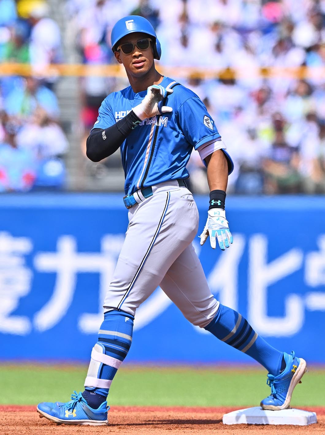 午後2時開始の屋外デーゲーム。まばゆい日差しに照らされても、おしゃれサングラスのおかげで視界良好だった。「普段つけないですけど。人工芝は照り返しが結構きついんで。思ったよりまぶしくて。で、つけました」。いつもと違うスタイルで試合に臨んでいた。