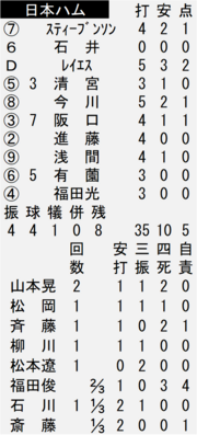 打線は巨人の9安打を上回る10安打を放ったが、及ばなかった。2番・指名打者のフランミル・レイエス外野手(28)は五回に4号2ランを放つなど、5打数3安打と快音を響かせた。