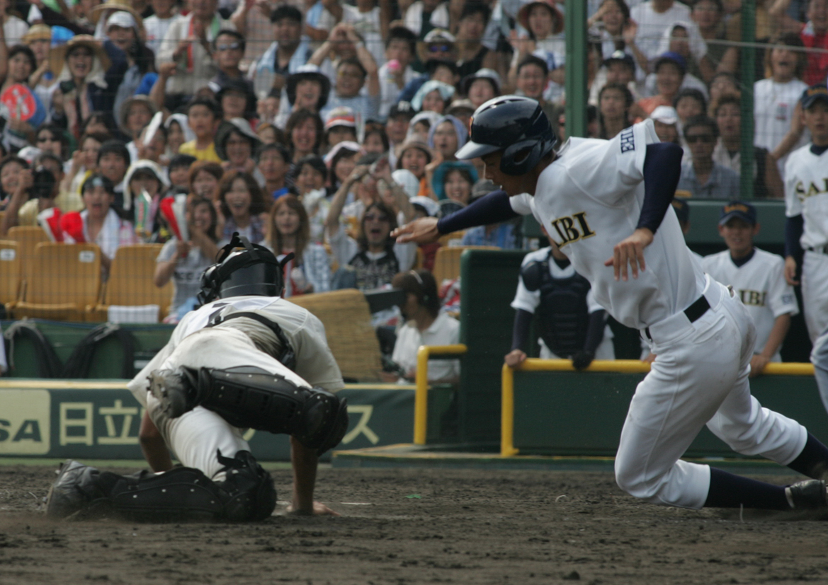 ―犠打と三振で2死二塁で五十嵐三塁手が驚異の粘りを発揮。フルカウントから5球連続でファウルで粘って12球目を左前へ。二走の佐々木主将が生還して9-9。シーソーゲームのまま七回へ