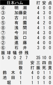 投手陣が奮闘を見せたものの、打線は振るわなかった。一、六、八回と得点圏に走者を進めながらも決定打を欠いた。0―2の九回、先頭の5番・浅間大基外野手(28)が二塁打で出塁。6番の今川優馬外野手(27)も左前打を放ち、無死一、三塁とチャンスを広げた。ところが、続く阪口楽内野手(20)が遊ゴロ併殺。その間に三走の浅間が生還したが、得点はこの1点のみ。8番の進藤勇也捕手(22)が空振り三振に倒れ、試合終了となった。