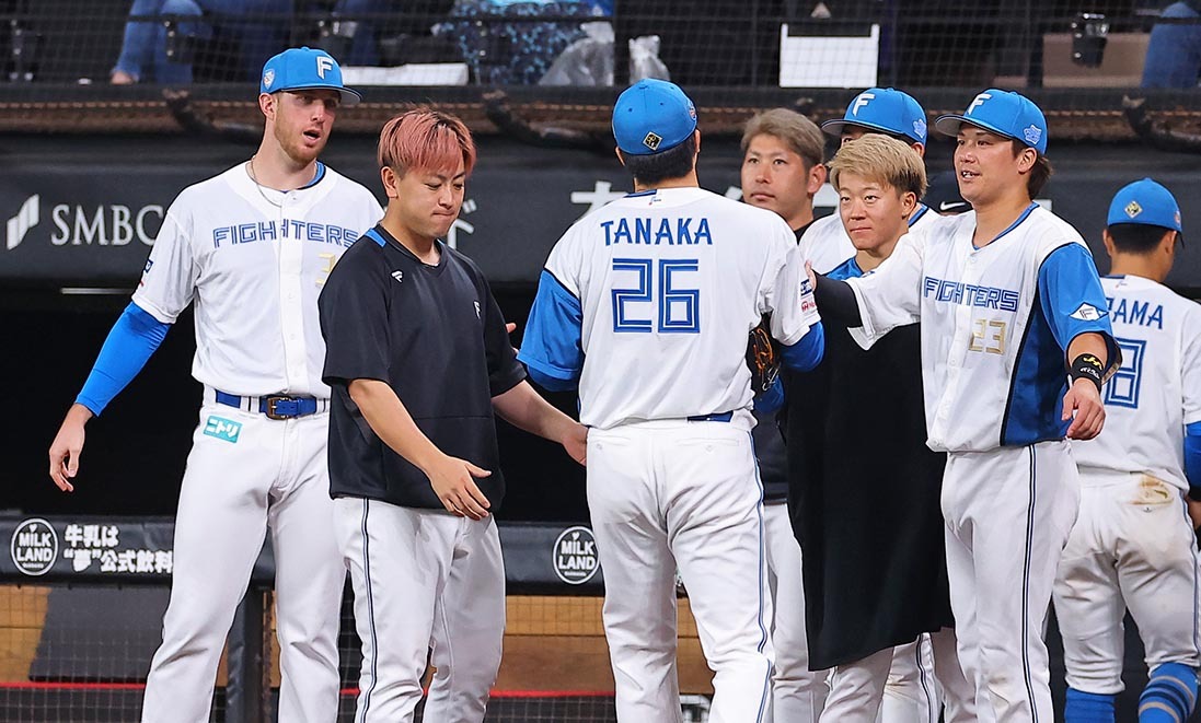延長十二回を無失点に抑えた田中正(中央)を迎える日本ハムナイン=撮影・井上浩明
