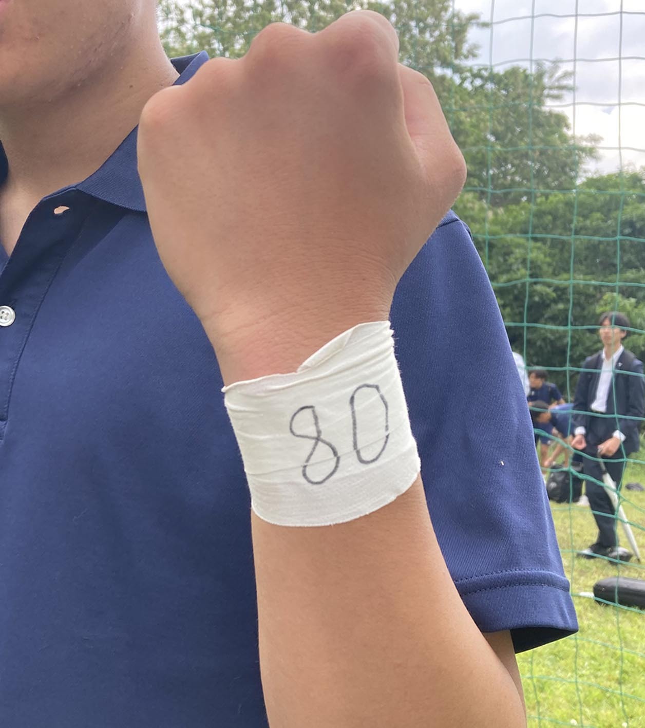 笹主将の左腕には「80」と書き込んだテーピングが巻かれていた。「森詩音くんっていう、1年生の時から試合に主力で出ていたんですけど、1月3日の裏選手権(新春高校強化研修大会)で右膝前十字靱帯を切ってしまった」。インターハイには間に合うと聞いた笹主将は「全員で詩音と全国に行くという意味で、僕はずっと試合の時はテーピングに80番って書いて出ている」。もう一度、同じピッチに立てると信じ続け、最後まで戦い抜くつもりだ。