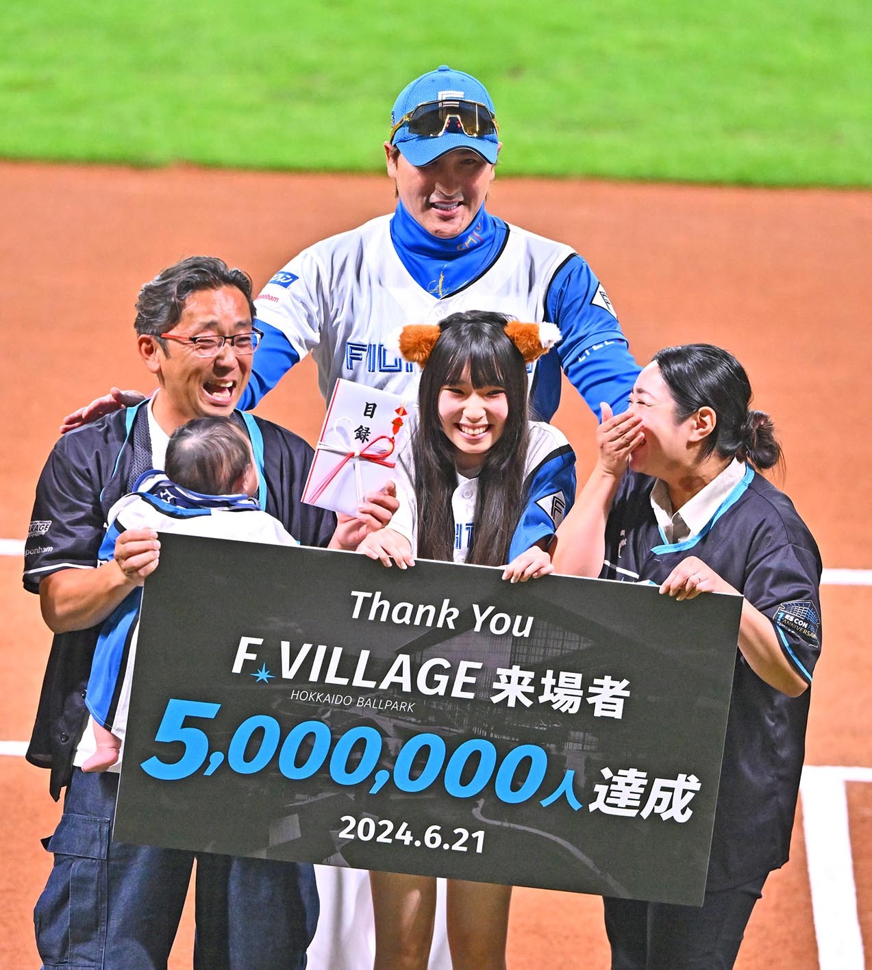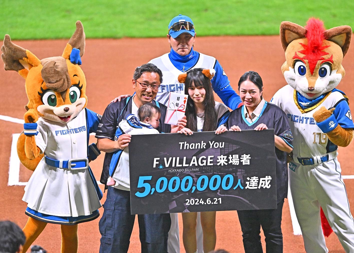 21日の楽天戦前にはセレモニーが実施され、500万人目の来場者となった小樽市の成田道昭さん一家がグラウンドに登場。新庄監督と記念撮影を行い、「今年は11回目の来場だったのですが、500万人目と聞いて大変、驚きました。夫婦で新庄監督のファンで、ファイターズを応援しています。これからも試合もグルメも楽しみたいと思います」と感激の面持ちだった。