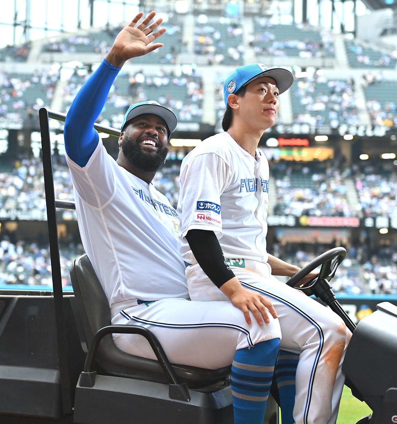 ヒーローインタビュー後、リリーフカーに乗り、スタンドのファンにあいさつするレイエス(左)と福田光