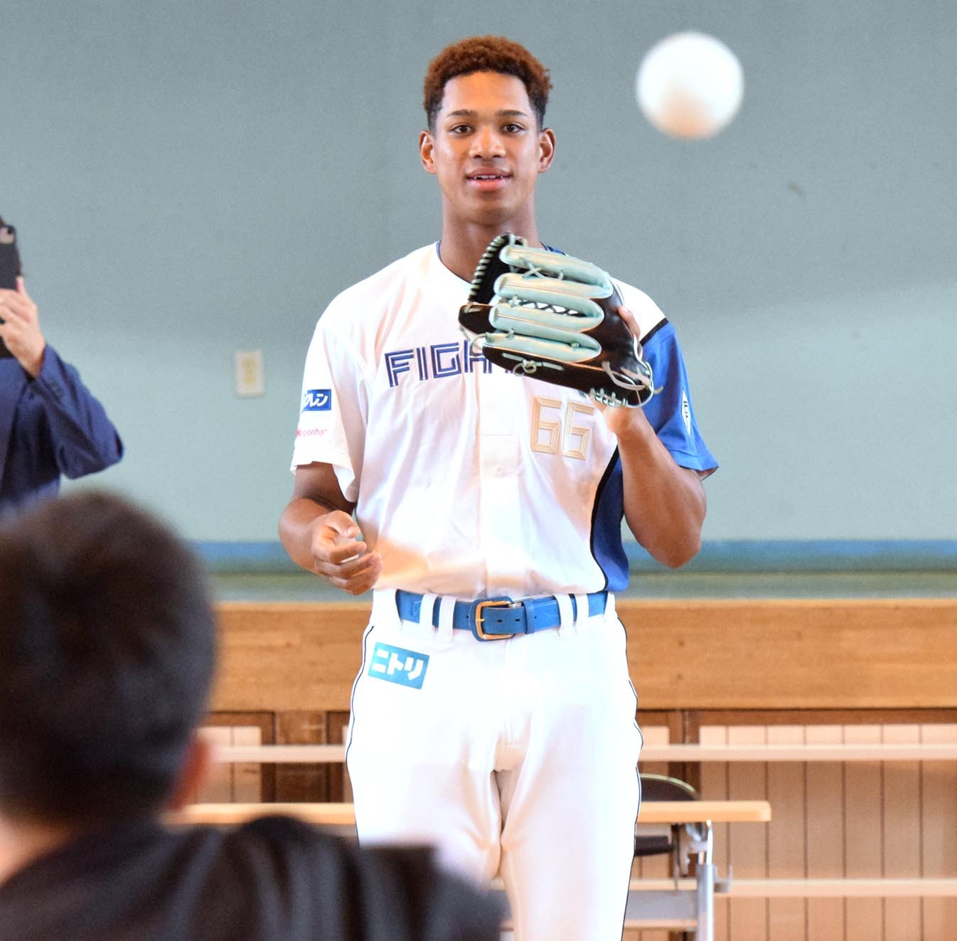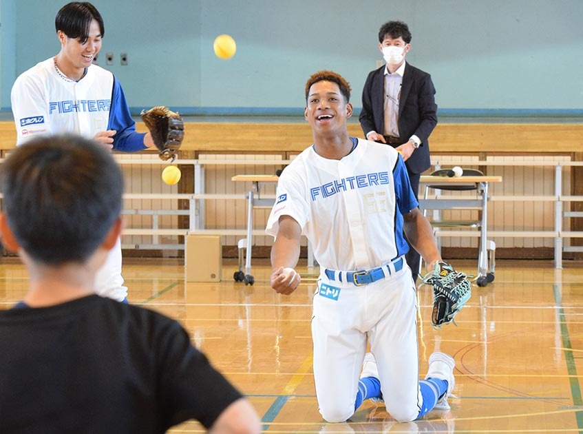 日本ハムの万波中正外野手(24)と細川凌平内野手(22)が1日、札幌市の新琴似南小学校を訪問し、キャッチボールや記念撮影で約370人の児童と交流した。