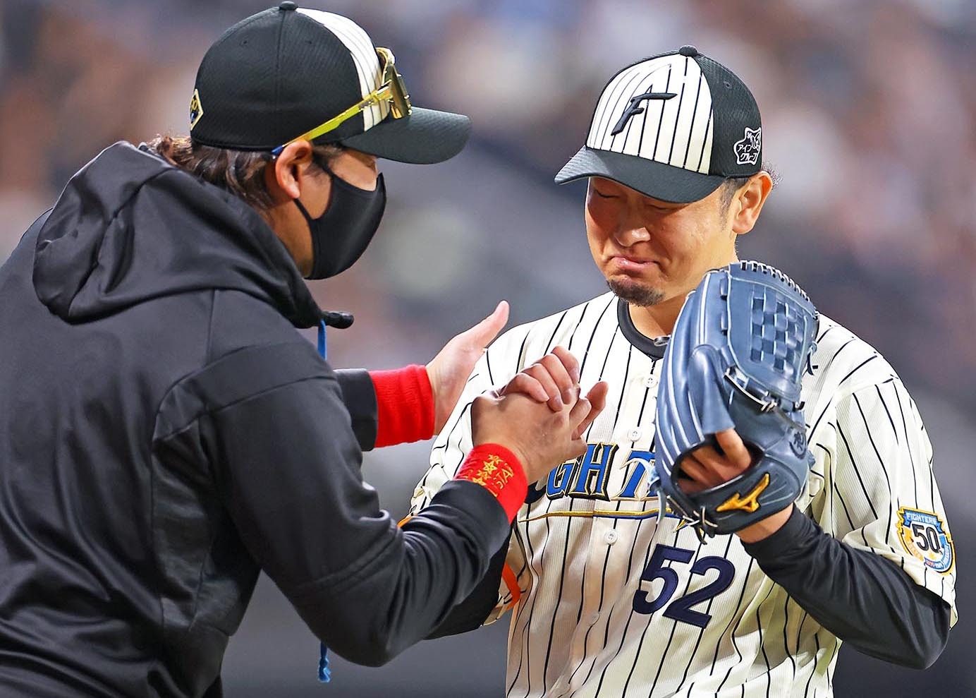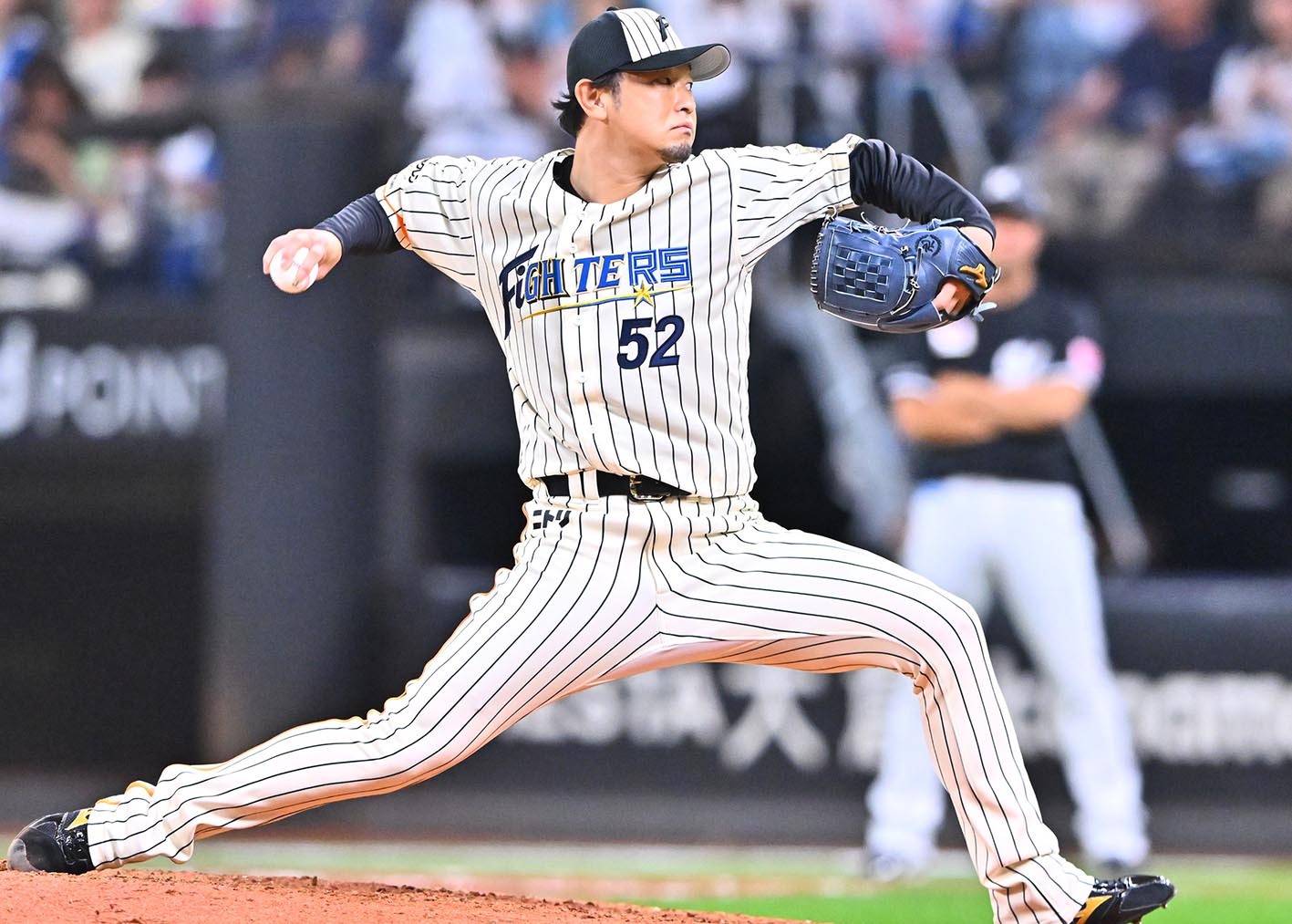 最速151キロをマークした直球を軸に、危なげなく3者凡退。ベンチ前ではリハビリ中にメッセージを送ってくれた新庄監督に迎えられ、「しんどいなと思っているときに、何度か連絡をもらった。今日こうやって結果を出せて良かったと思います」。何点差でも八回での起用を決めていたという指揮官の気持ちに応えた。