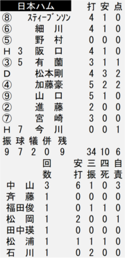 打線は一回、有薗直輝内野手(21)の右犠飛で先制。さらに松本剛外野手(30)の適時二塁打で1点を加えた。2―0の三回には再び松本剛が適時打。加藤豪将内野手(29)も適時二塁打を放ち、2点を挙げた。4―4の八回には先頭の4番・有薗が四球。続く松本剛が左前打でつないで一、二塁とした。ここで加藤豪が敵失を誘って1点を勝ち越し。さらに1死満塁と攻め立て、代打の今川優馬外野手(27)の押し出し死球で6―4とした。九回には加藤豪のタイムリー内野安打で7―4とした。