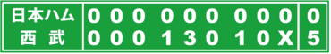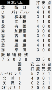 先発登板したドリュー・バーヘイゲン投手(33)が4回5安打1失点と試合をつくったが、打線の援護に恵まれなかった。2番手登板した北浦竜次投手(24)は五回、自身の暴投が重なるなどし、5安打3失点(自責点1)と精彩を欠いた。3番手の矢沢宏太投手兼外野手(23)は2回をノーヒット投球も、2四球が響いて犠飛で1点を献上した。