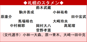 札幌は2点目を失う直前の後半20分、初スタメンだった大﨑と原に代えてMF田中克幸(22)、MF青木亮太(28)を投入して反撃したが、鹿島ゴールをこじ開けることはできなかった。後半40分、田中克のFKに反応したDF岡村大八(27)がヘディングで押し込むが、GK早川にセーブされた。アディショナルタイムに入ってからも、途中出場の青木、大森と立て続けに枠内に強烈シュートを放ったが、鉄壁の守備に阻まれた。J1残留圏内の鳥栖が勝ったため、勝ち点差が12とさらに広がった。
