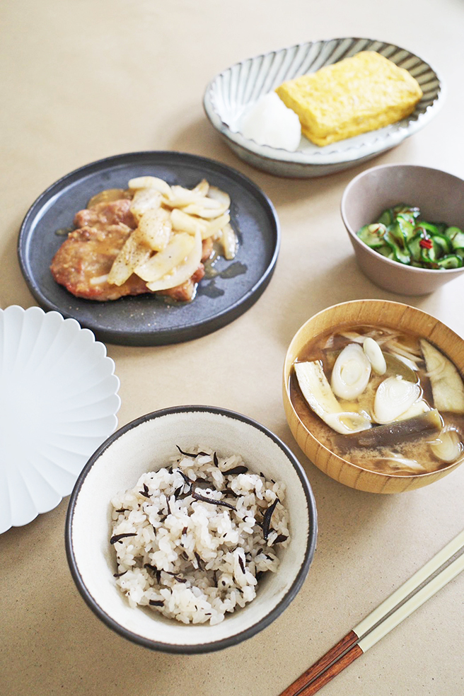 ボリューム満点の鍵谷家の朝食。生姜焼き、卵焼き、ひじきご飯、ナスとネギのお味噌汁、きゅうりの浅漬け