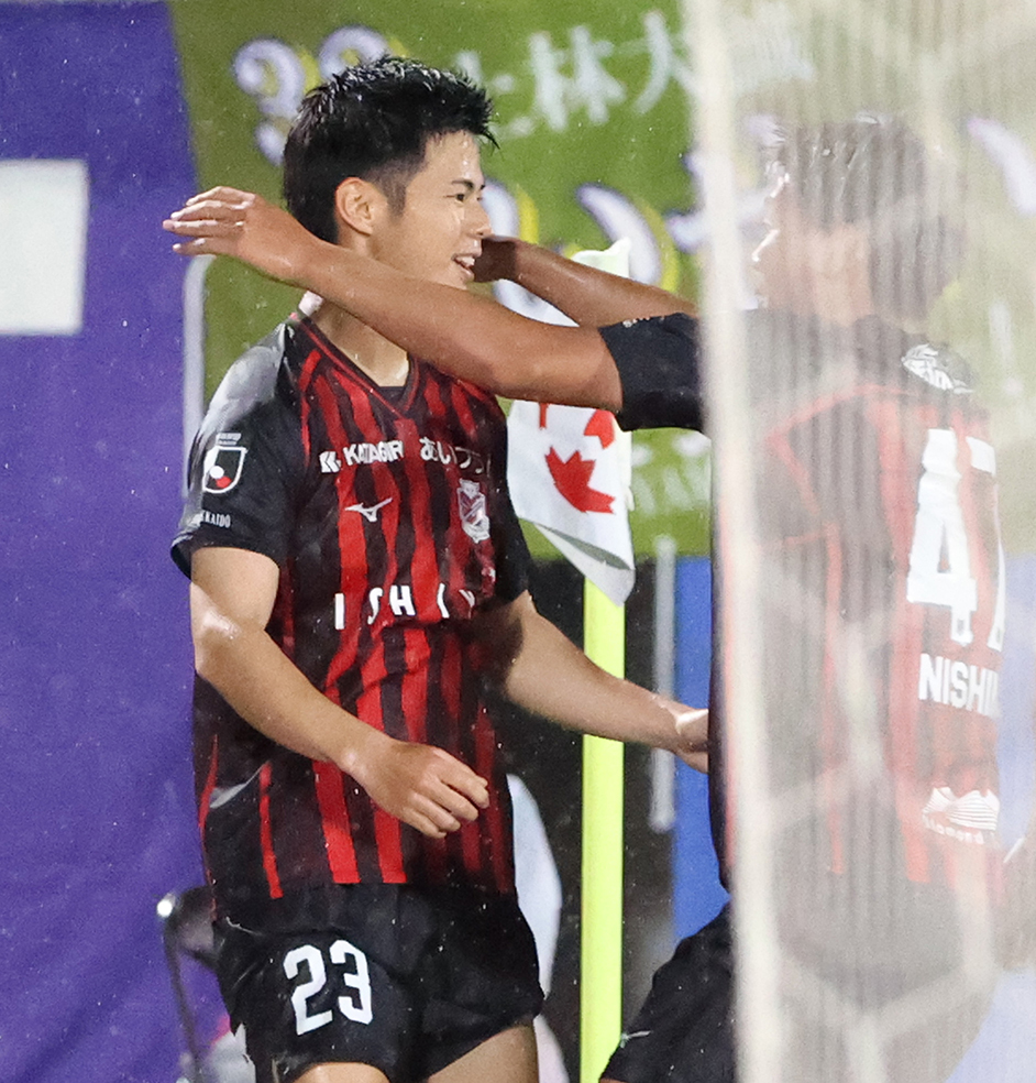 降りしきる雨の中でキックオフの笛が吹かれた。開始早々の前半6分に、いきなり試合を動かしたのはMF田中克幸(22)の左足だった。ペナルティーエリア手前やや右の位置で得たFKを直接ゴールへと蹴り込んでネットを揺らした。田中克の嬉しいプロ初ゴールで札幌が先制に成功する。