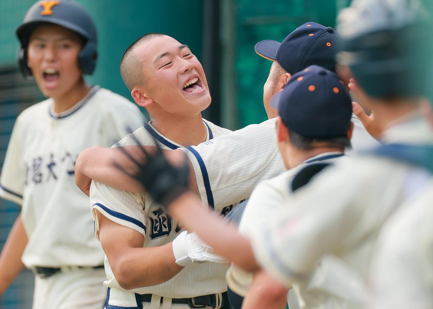 九回、南大会第1号となる公式戦初本塁打を放ち、ベンチ前で喜びを爆発させた函館大有斗の能戸主将(中央)=撮影・大石祐希