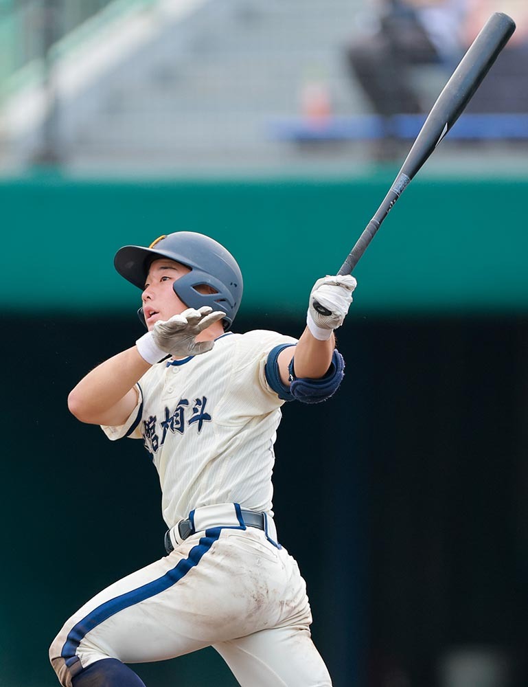 九回、南大会第1号の左翼越え本塁打を放つ函館大有斗の能戸主将