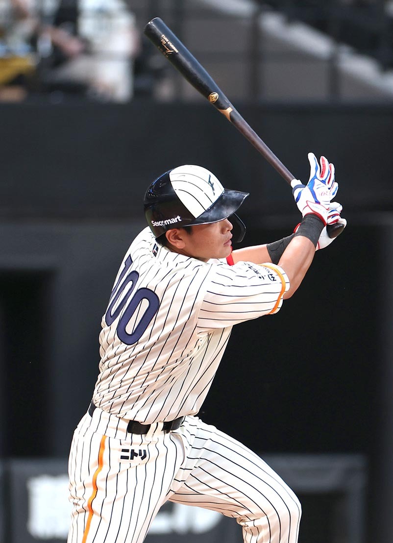 ルーフオープンされたエスコンに、快音を響かせた。4点を先制された直後の二回。2死三塁で打席に入った野村はカウント1-2から、楽天・滝中のスライダーを左前にはじき返した。2点差に詰め寄る一打に球場も大きく沸いた。初球、2球目は同じようなスライダーを空振りしていたが、追い込まれた後は同じ轍(てつ)を踏まなかった。