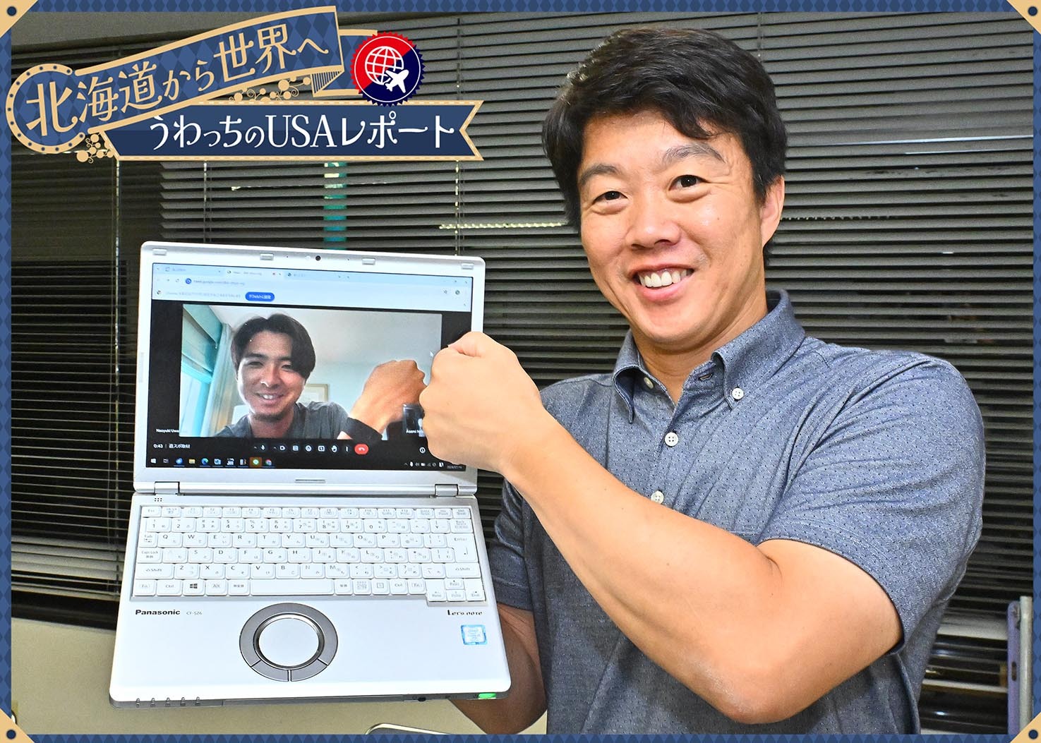 パソコンの画面越しに上沢とグータッチする鶴岡氏=撮影・桜田史宏