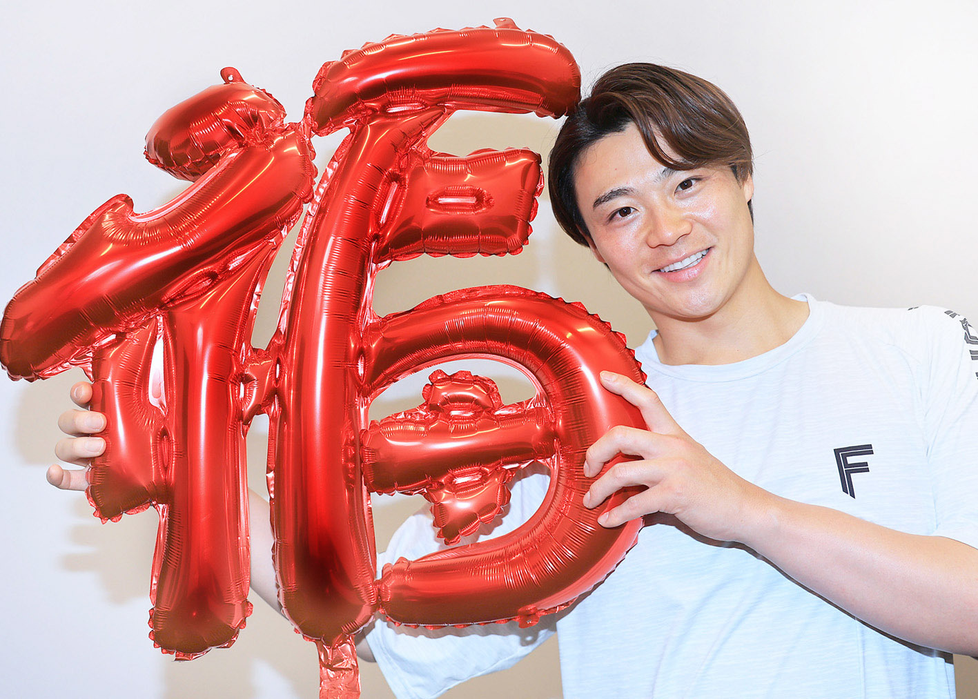 “福(さち)”バルーンを手に笑顔の山崎=撮影・松本奈央