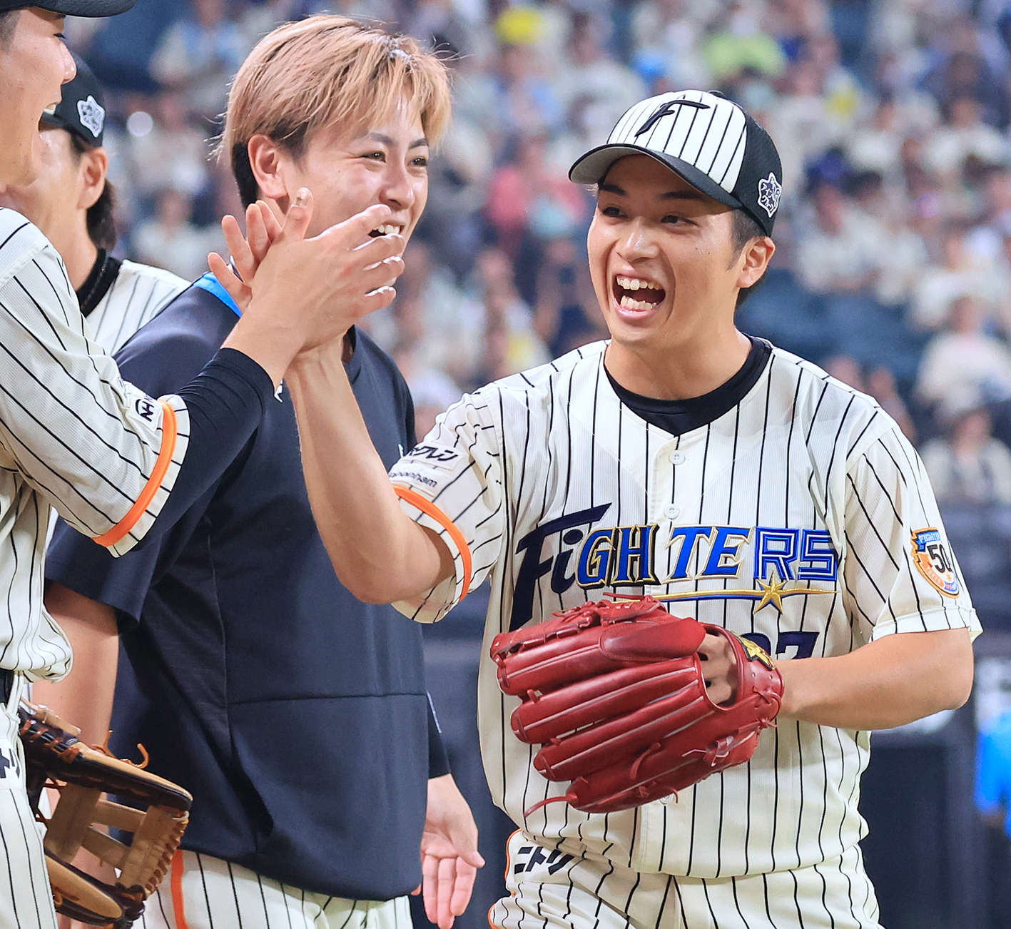 7月12日のソフトバンク戦、延長十一回2死一、三塁、宮西の後を受け、無失点投球を披露した山本拓(右)を笑顔で迎えた河野