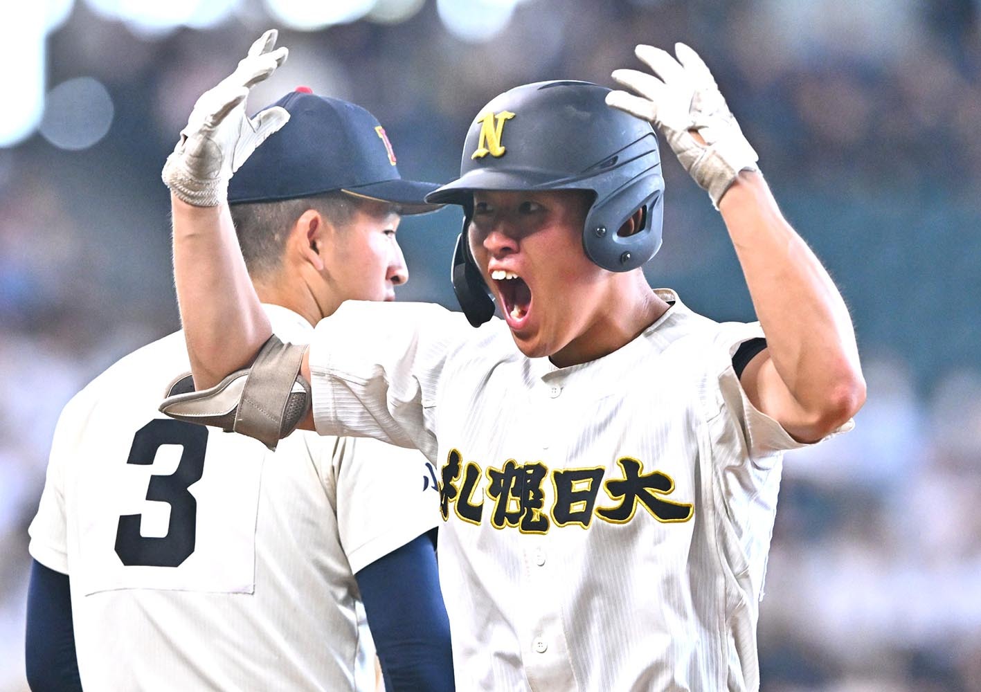六回2死三塁から決勝打を放った札幌日大高の高橋は塁上で大きなガッツポーズを見せる